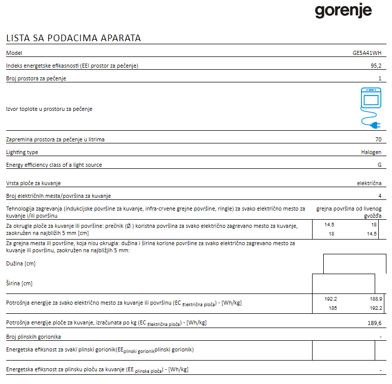 | Površina za kuvanje | - Zona kuvanja napred levo Ekspres električna ringla - Ø napred levo (mm) 180 - Snaga zone za kuvanje napred levo 2000 W - Snaga zone za kuvanje napred desno Standard hotplate - Ø napred desno (mm) 145 - Snaga zone za kuvanje napred desno 1000 W - Zona za kuvanje nazad levo Standard hotplate - Ø levo iza (mm) 145 - Snaga zone za kuvanje nazad levo 1000 W - Zone za kuvanje nazad desno Standardna električna ploča sa temperaturnim ograničavačem - Ø desno iza (mm) 180 - Snaga zone za kuvanje nazad desno 1500 W |